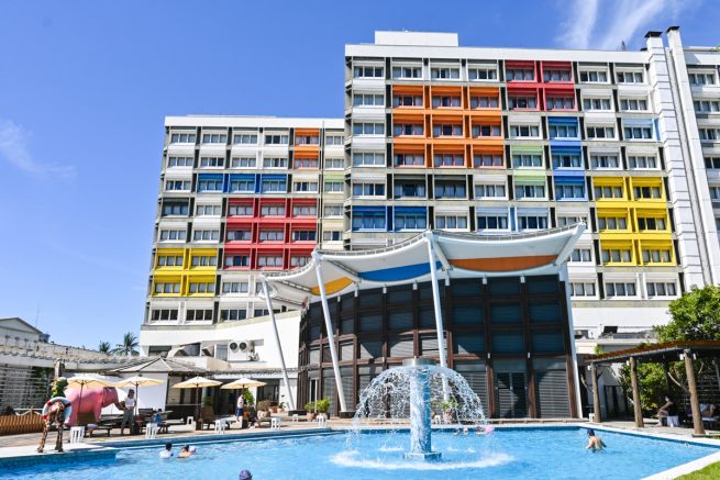 ▲飯店建築有一面是面海景,高樓層的客房每個電梯外都有設有觀海沙發區,黃昏時刻坐在這裡看著海景,真是一種享受啊!