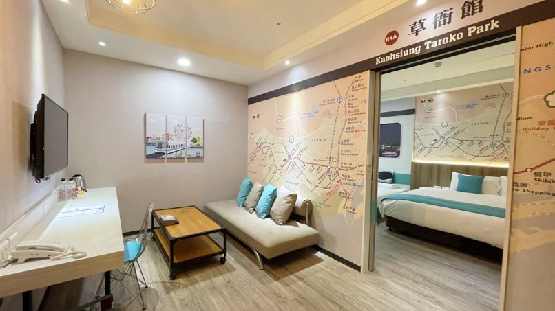 以高雄捷運為元素打造的捷運親子房,坪數有 15 坪,空間比較大,提供一大床 216x190cm + 一臥榻 154x190cm。