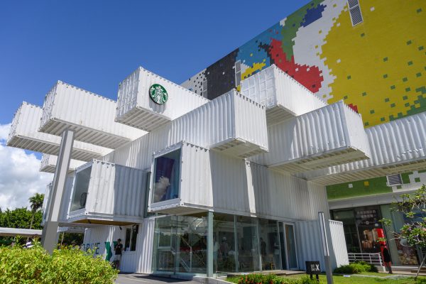 「星巴克-洄瀾店」是亞洲首間貨櫃屋門市,由建築大師隈研吾一手設計。以 29 個來自世界各地的白色碼頭建造成貨櫃屋,彼此交叉堆疊成四層高度,搭配透明玻璃,讓有些空間享有天窗的浪漫。