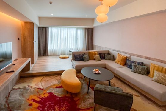 此房型為 12 坪大的豪華家庭客房,床為兩中床 (160*200 CM),整體挑高舒適,牆面使用橘色調呈現柔和感,加上簡約的設計風格,沒有多餘的裝飾卻好好看。另外,從房間的大型觀景窗可以遠眺遠方景致,很是享受!