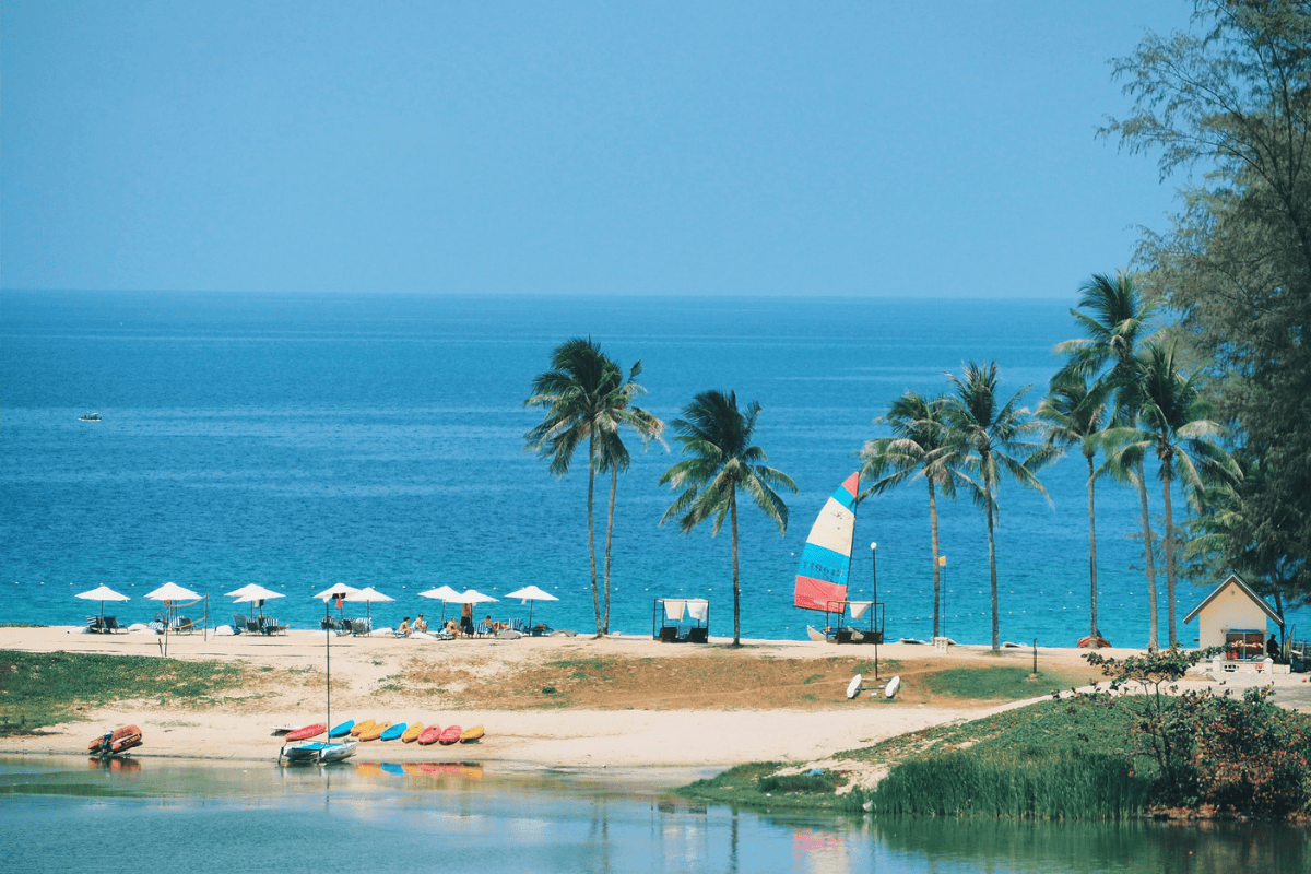 住客可以乘坐免費的接駁小船,只要大約 3 到 5 分鐘,小船就會載著你穿過美麗的潟湖,抵達對面的沙灘入口。這裡是普吉島最長的海岸線之一,沙質細軟,海水清澈平緩,非常適合親子戲水。沙灘有飯店準備的躺椅與遮陽傘,還有海邊的飲料服務,這裡也是非常棒的夕陽觀賞點!