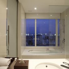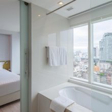 此房型的淋浴間與臥室只有一片窗簾隔開,讓整體房間視野更為寬闊。