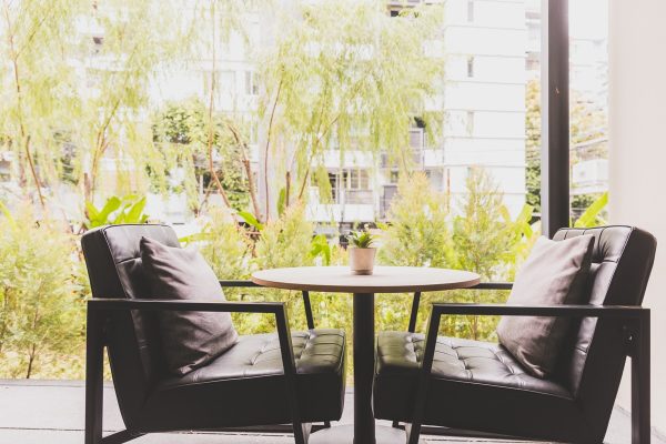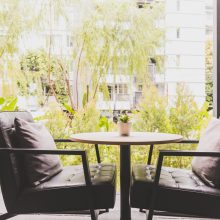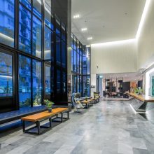 大廳採挑高設計,金屬質感的大片落地窗,現代感的傢俱與植栽點綴,空間充滿一股文藝氣息,不說還以為來到咖啡廳。