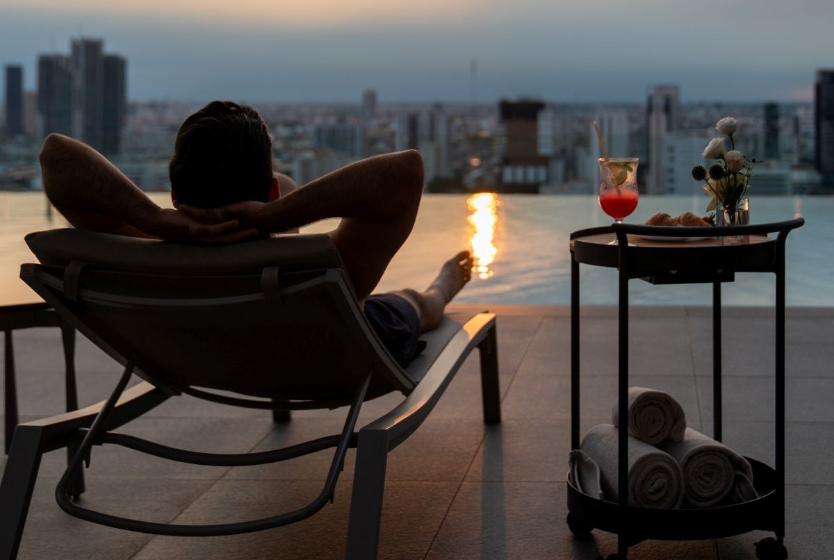 無邊際泳池位於 35 樓,泳池長度約 50 公尺,是典型池型。景觀遼闊,可俯瞰曼谷天際線與皇家體育俱樂部,無論晨泳或日落都是絕佳體驗。