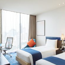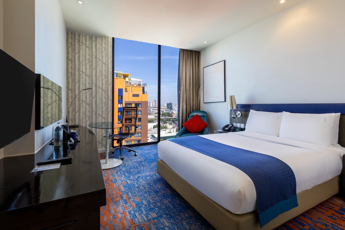 Holiday Inn Express Bangkok Siam 客房主打舒適度,房內設有落地窗可飽覽窗外景觀、高品質床鋪以及可依喜好選擇柔軟或堅挺的枕頭,打造自己專屬的睡眠體驗,讓旅客無論商務或休閒都能輕鬆入住。