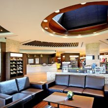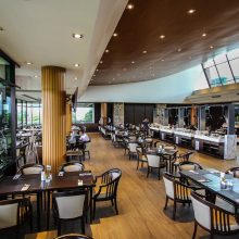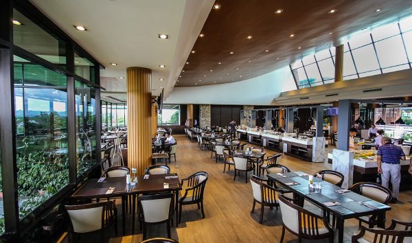 餐廳提供日式和歐式特色菜餚,一旁還有自助的甜點與飲料可供享用,大面落地窗讓遊客從用餐區就可欣賞高爾夫球場的遼闊全景,非常舒服。