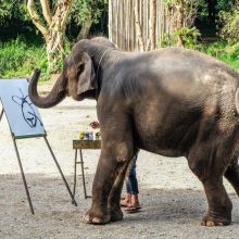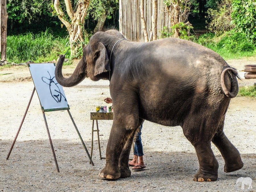 ▲大象正在表演牠的畫畫才藝,這些由大象現場執筆所完成的畫作,絕對讓你看了歎為觀止!