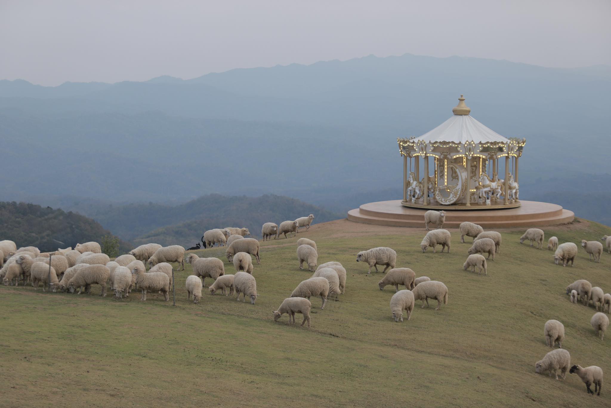 在園區內,遊客可以購買飼料近距離餵食綿羊、拍照互動,十分療癒。園內也設有不少拍照打卡點,例如旋轉木馬(體驗需額外付費)與哈比人小屋等夢幻場景,搭配背後的山巒與雲海,隨手一拍都像童話般的浪漫畫面。園區咖啡廳則提供咖啡、甜點與輕食,可以一邊喝咖啡、一邊欣賞山景,享受清萊山區獨有的慢步調時光。