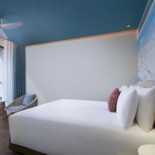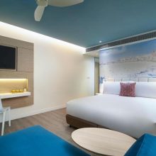 Superior 房擁有大片落地窗面街景,還有讓你在窗邊休息的藤椅。房內清爽的藍白色調,搭配牆面上的海灘風景讓人感到愜意,很有渡假的氛圍。