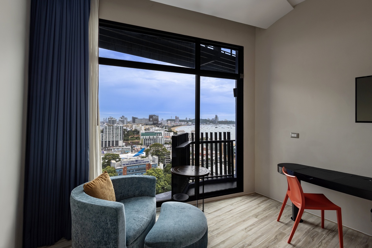 Deluxe Ocean View Room 的室內格局與 Deluxe Room 基本相同,差別在於此房型設有陽台,並且在房內就可欣賞到芭達雅迷人的海景與市景。