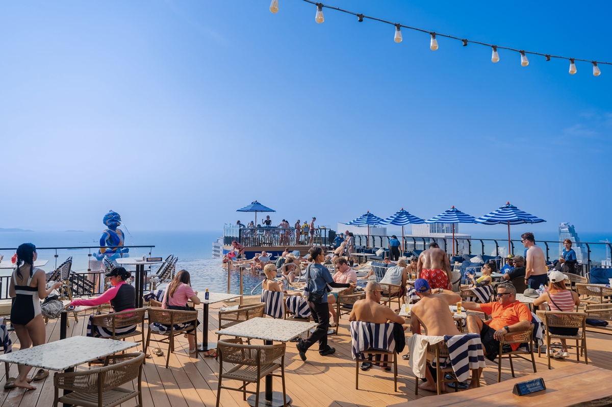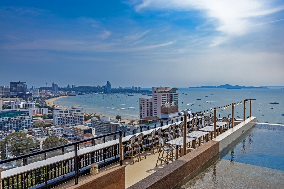 ▲客人可以在屋頂泳池旁品嚐創意調酒與國際美食,欣賞芭達雅海灣全景,白天享受慵懶海灘氛圍;到了夜晚,則可隨著現場 DJ 音樂表演盡情狂歡。(DJ 表演時間:每晚六點到七點)