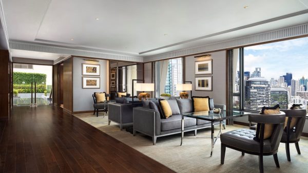 Grand Premier Room 設有獨立的起居室和臥室,可以選擇一張加大雙人床或兩張單人床,房內還有客廳、小廚房、洗衣機和烘乾機,可以輕鬆地躺在客廳沙發上,伸展身體並放鬆身心。浴室更設有獨立浴缸和獨立淋浴間。步入式衣櫃配有自己的梳妝台、鏡子和椅子。房間整體採用現代泰式設計來平衡空間的商務氣氛,而大片落地窗讓房間採光極佳,給人一種奢華又優雅的氛圍。