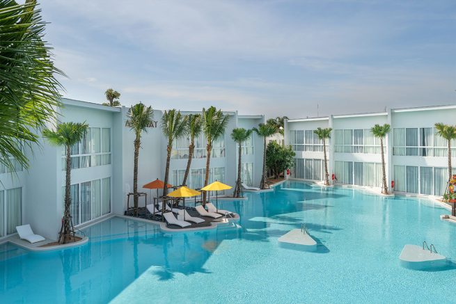 度假村內打造出地中海式的度假泳池,周圍還有兒童泳池、水上樂園、海灘休憩區、餐飲區,可以一整天待在這裡享受玩水的樂趣,度過美好的假期時光。