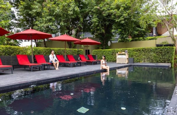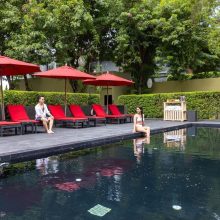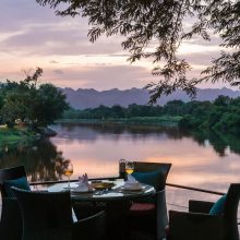 室外游泳池毗鄰餐廳 Thai Peppers Restaurant,環繞著美麗的花園,遠眺還可以欣賞到桂河美景。
