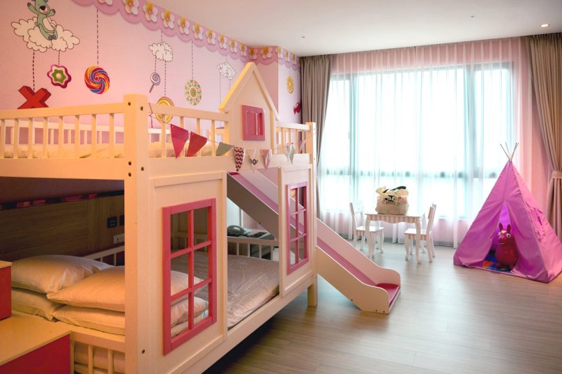 真不愧是親子飯店!這根本是直接瞄準孩子們的心來設計房間吧(笑)夢幻繽紛的房間色系與裝飾、跳跳馬跟帳篷,太高竿了!米米親子房的房型都是上下鋪,一旁的階梯相當穩固,不必擔心底座不穩;上鋪的另一側則是滑梯,這已經可以說是孩子們心目中的夢想床鋪第一名了吧!此外,房間相當寬闊,裡面也有提供專門給孩子們使用的安全無毒彩繪兒童桌椅,不僅在這裡跑動沒問題,想坐在地上玩玩具也很可以。