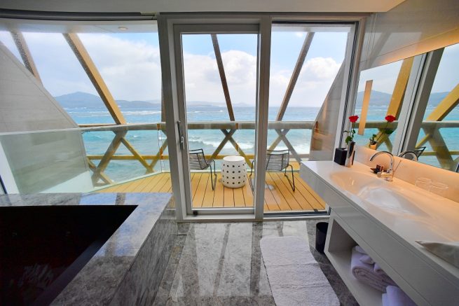 想要更有出國度假住 villa 的感覺?那海畔房型絕不會讓你失望~ 這個房型都位在 1F 生態花園旁邊,房間坪數更大,一共有38坪啊!當然,最大的賣點是它有超大的露天平台和戲水池阿(尖叫聲!!!),再加上前方的海景,真的是 TAEBAK(대박) 啊~~~